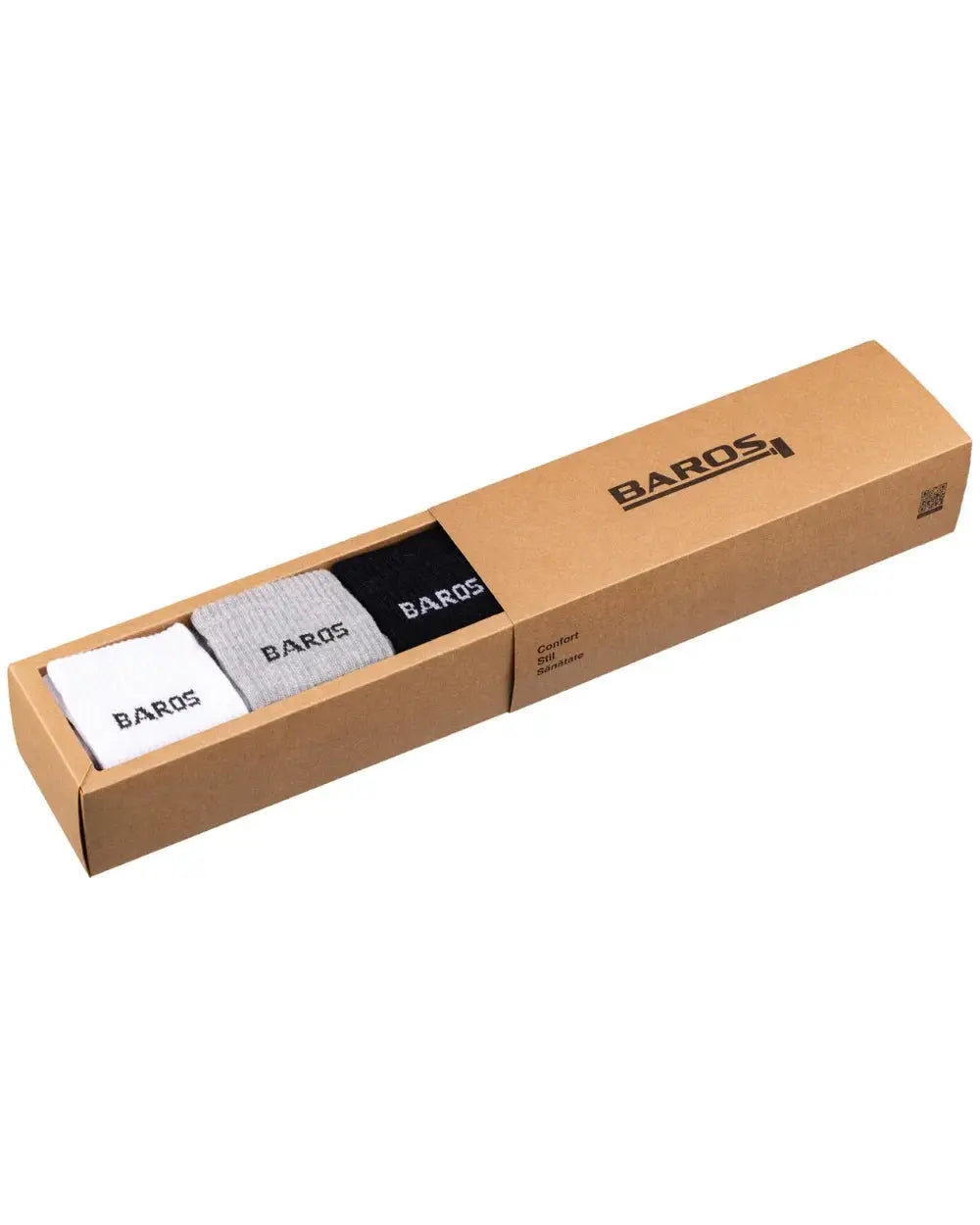 Set of 3 pairs of men's long cotton socks BAROS trio 1x black/1x grey/1x white , size 40-46, BAROS, are ideal for any occasion. Seamless, they are made from a combination of 86% combed cotton, 12% polyamide and 2% elastane, providing all-day comfort and durability. The set includes one pair of each color.